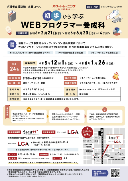 | 訓練実施施設 | 〒640-8324 和歌山県和歌山市吹屋町5-35-1 ITスクール エルガ |